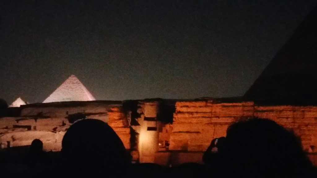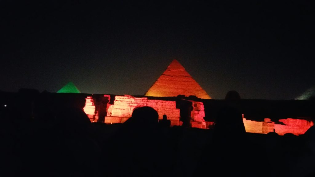カイロ・ギザの中で一番大きいクフ王のピラミッド、2番目に大きいカフラー王のピラミッド、3つの中で一番小さい、メンカウラー王のピラミッド、スフィンクスが光に照らされました。