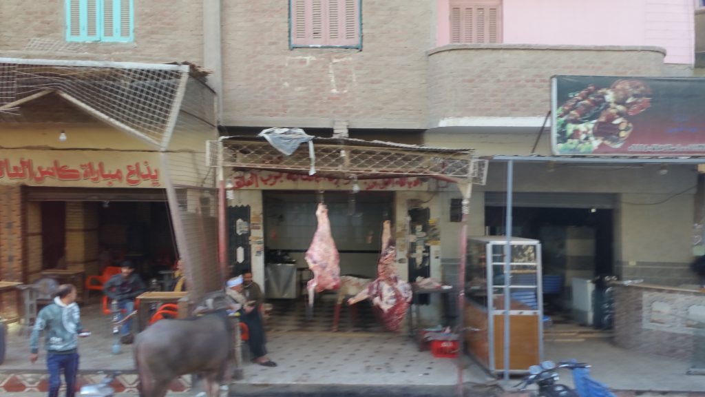 肉屋が多く見られました。バス中からの写真にてピンボケです。