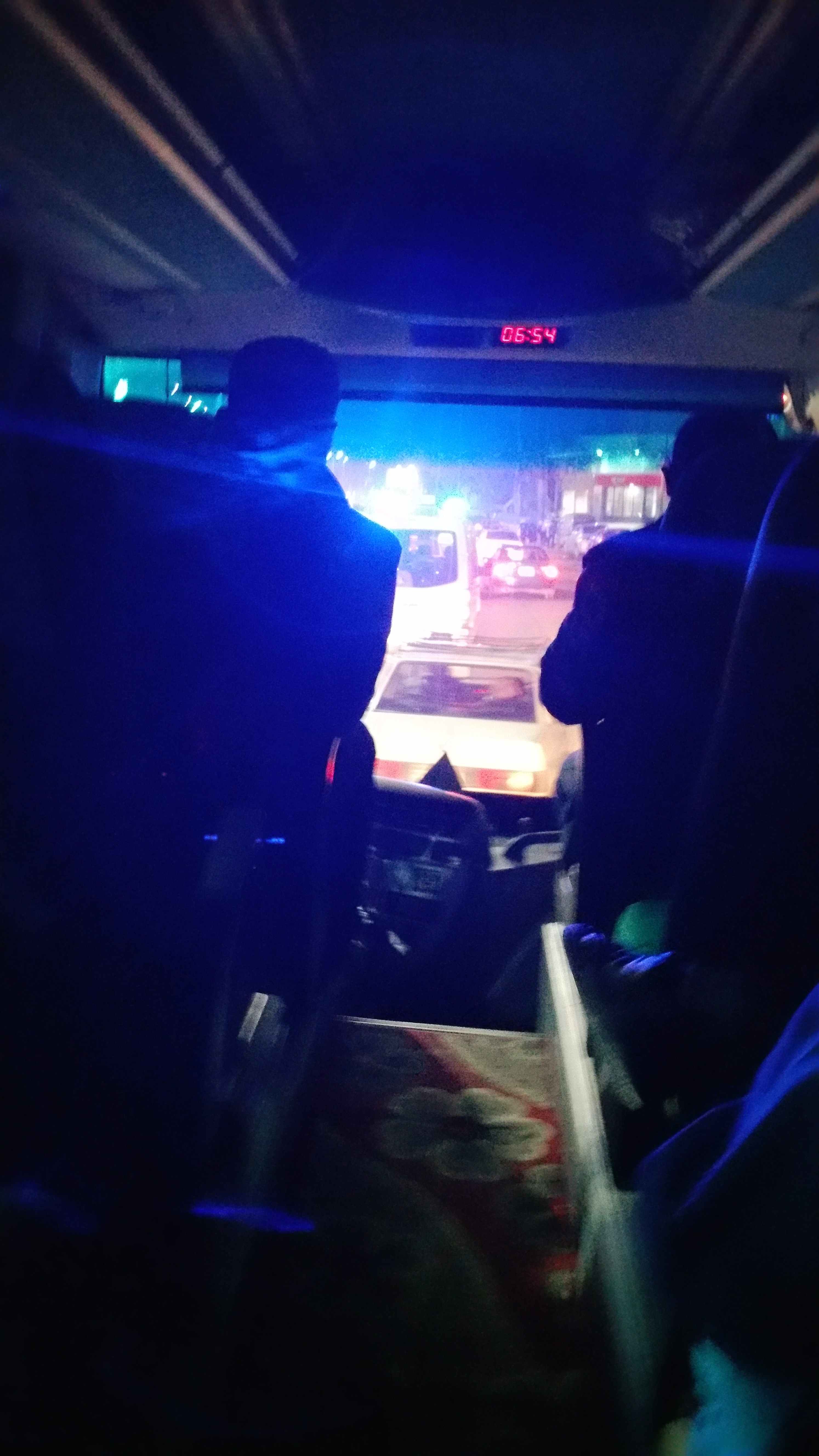 バスの左前にはポリス、隣にはパトカー誘導・ショッピングでは銃を持った方が、警備?お喋り?