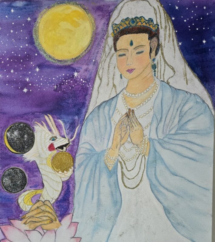 新月~満月の願いを白龍が、月の女神に「この者の願いを、叶えてあげて下さい🙇真面目で素直な方です。どうか救って下さい。宜しくお願い致します」大切な願いを金の玉に託して、月の女神へ届けにいきます。月の女神は沢山居ますので、持たれる方に必要な方がサポートされます。